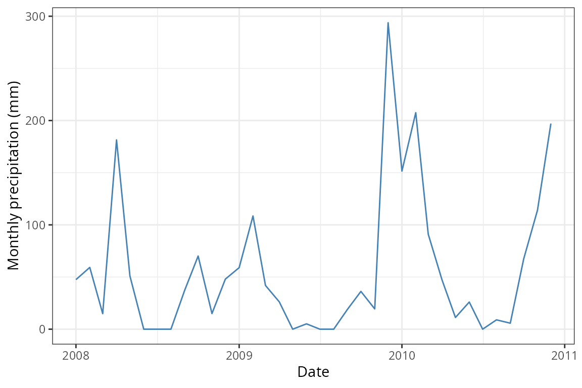 labs(x = "Date", y = "Monthly precipitation (mm)") +